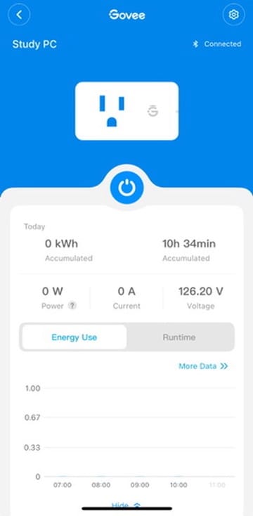 Next, I tried the Govee Power Monitoring Plug. Its functionality was limited, providing only instantaneous data and oddly aggregated graphs. The timed measurement capped at 100 seconds, which was impractical, and it lacked Home Assistant integration.