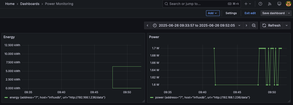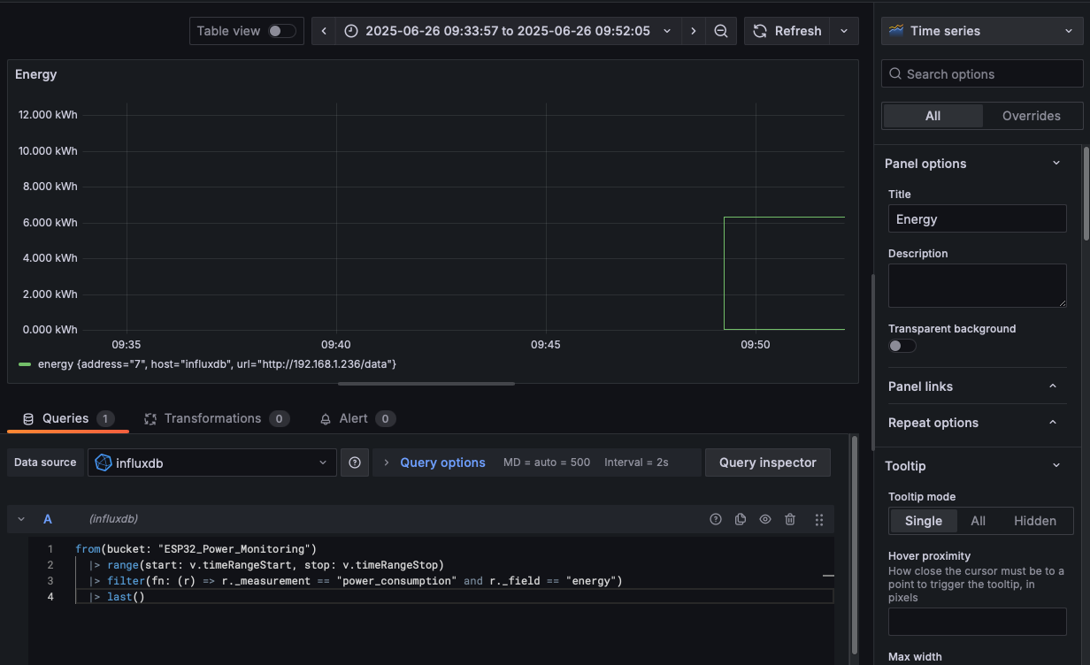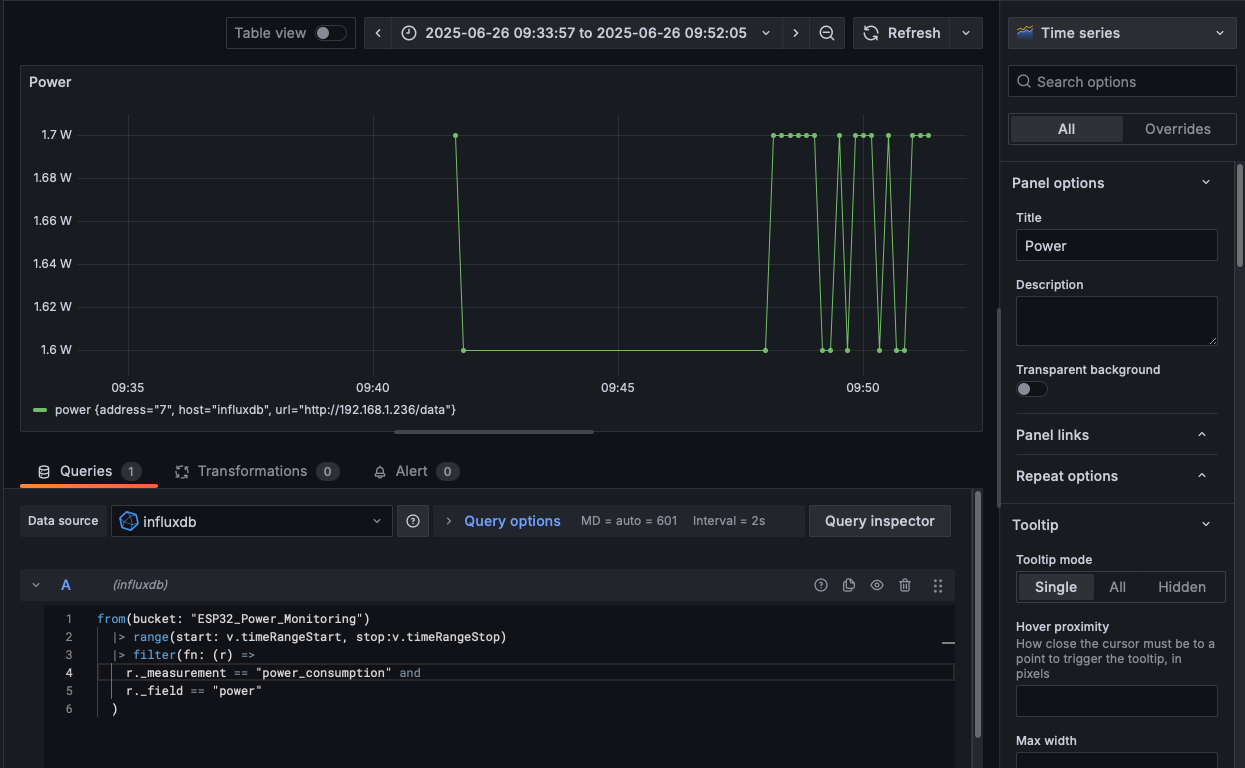 - Enter your InfluxDB server (http://192.168.1.152:8086), API token (read scope for ESP32_Power_Monitoring), and organization.
