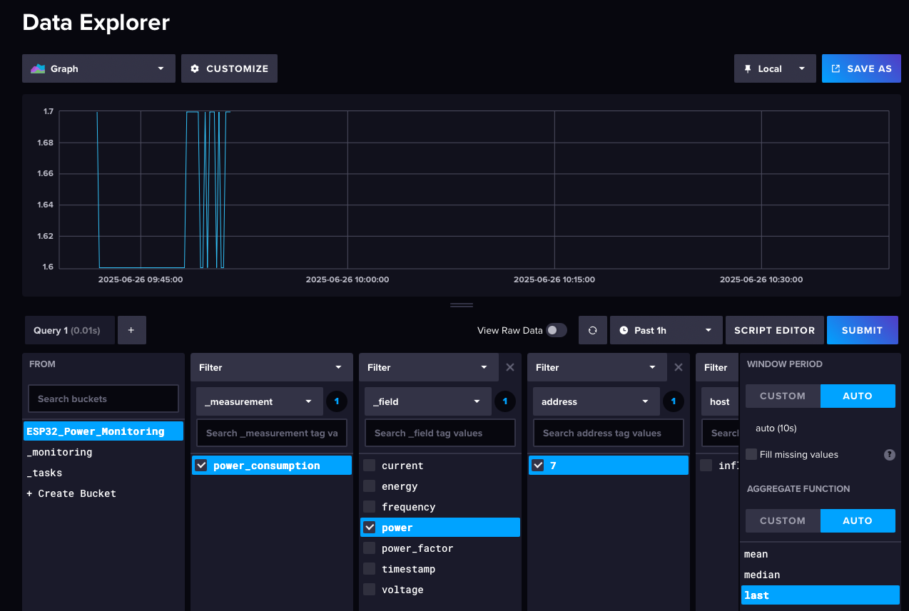 - bucket = "ESP32_Power_Monitoring": Match your bucket name.