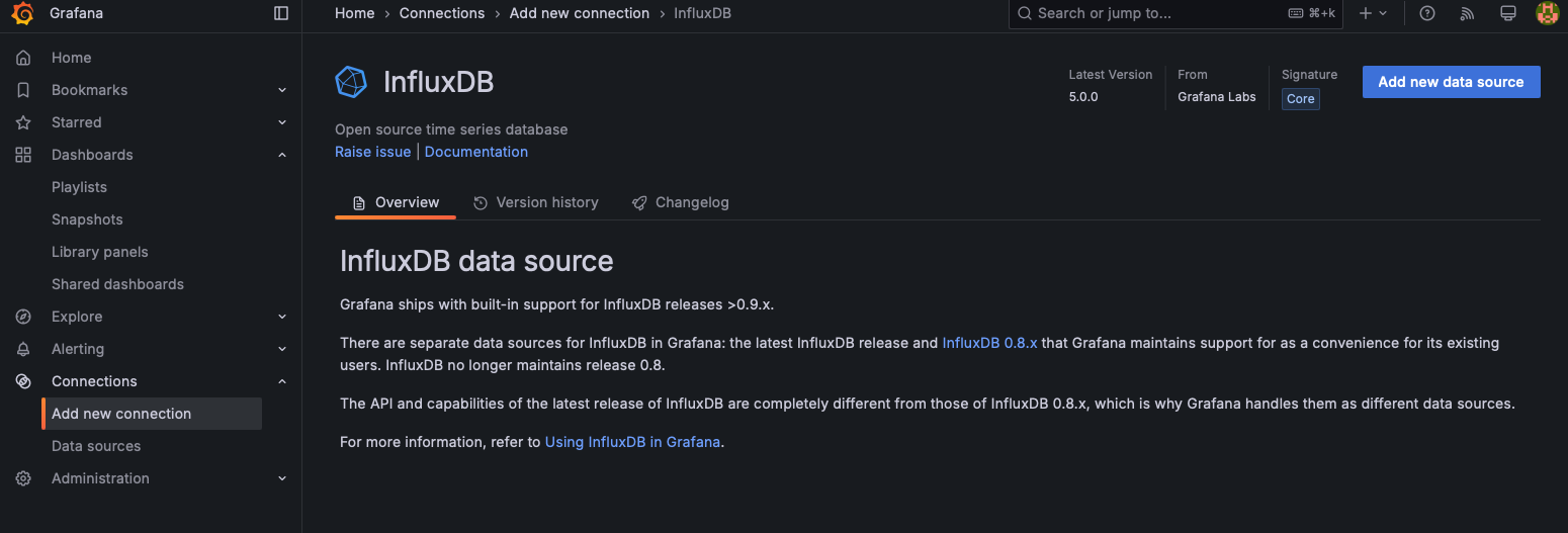 Go to Connections > Add new connection, search for InfluxDB, and click Add new data source.