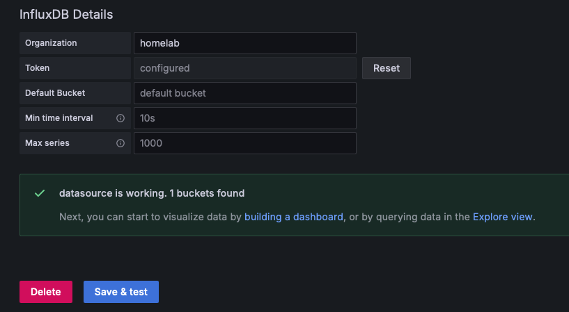We will use the Telegraf to poll the data, and subsequently insert it to the data bucket. Configuration for Telegraf can be found in the repo. You will have to change the necessary lines to match your setup.