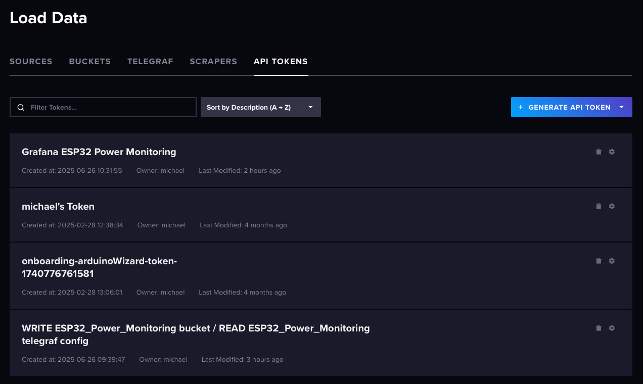 I won’t go into too much detail into how to set up InfluxDB as the documentation is plentiful. I used Proxmox Helper Scripts for InfluxDB to deploy an LXC, went through the setup process and it was up and running in no time. Then, I created a bucket named “ESP32_Power_Monitoring” and generated an API token. I prefer to set the API token as an environment variable, but you can also hardcode it into the Telegraf configuration file, which we will be getting to next.