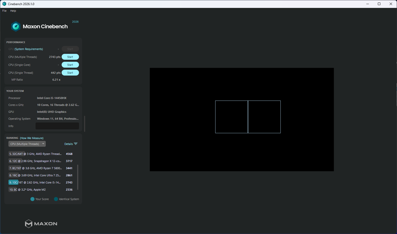 Cinebench 2026 testing yielded 442 points single-threaded and 2743 points multi-threaded. The multi-threaded result is particularly strong, showcasing the hybrid architecture's ability to leverage all ten cores effectively under sustained workloads. The single-threaded score confirms competitive per-core performance that translates directly to snappy application responsiveness.