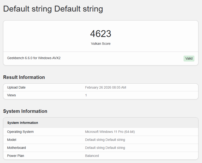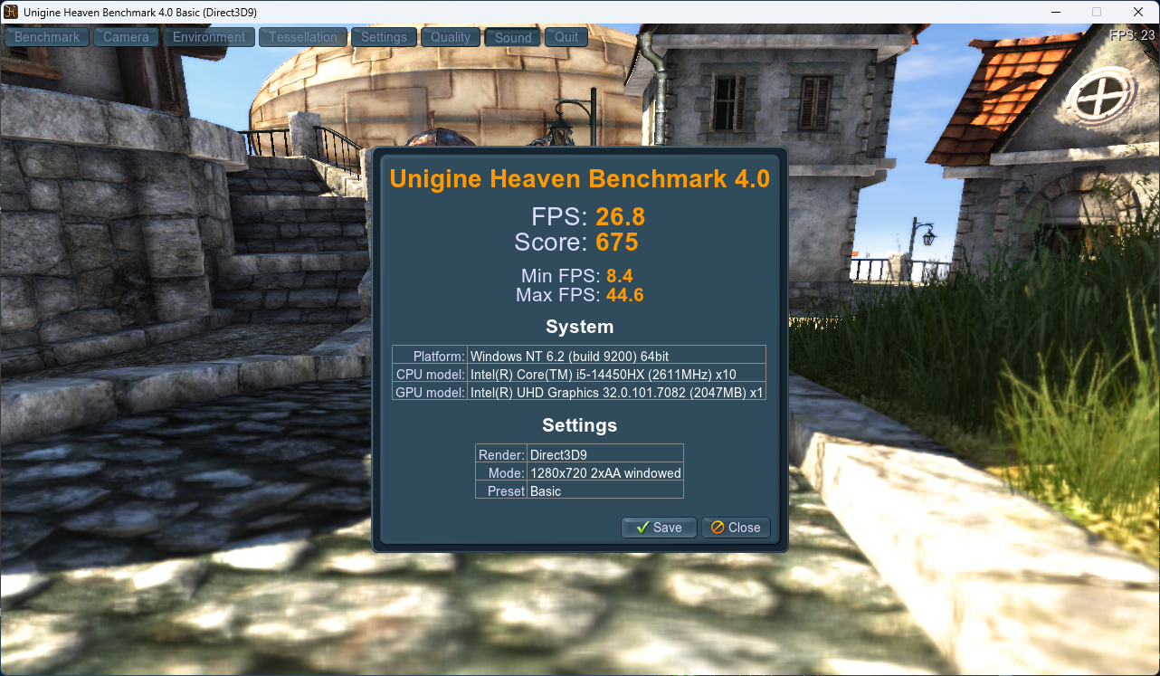 Geekbench 6 returned an OpenCL compute score of 4027 and a Vulkan score of 4623. For context, the older i9-11900H achieved an OpenCL score of 7334, nearly double. The i9-13900HK, built on the same Raptor Lake architecture but using the proper mobile die with Iris Xe and 96 execution units, scored 14730 in OpenCL, nearly 3.7 times the 14450HX's result. The Heaven Benchmark painted an even starker picture: 26.8 FPS with a score of 675, compared to 47.2 FPS for the i9-11900H and 68 FPS for the i9-13900HK. Perhaps most damning of all, AMD's budget Ryzen 5 7430U (a rebranded 5600U with the aging Vega 7 iGPU) scores 8468 in Geekbench 6 OpenCL, more than double the 14450HX's result, even when hamstrung by single-channel RAM.