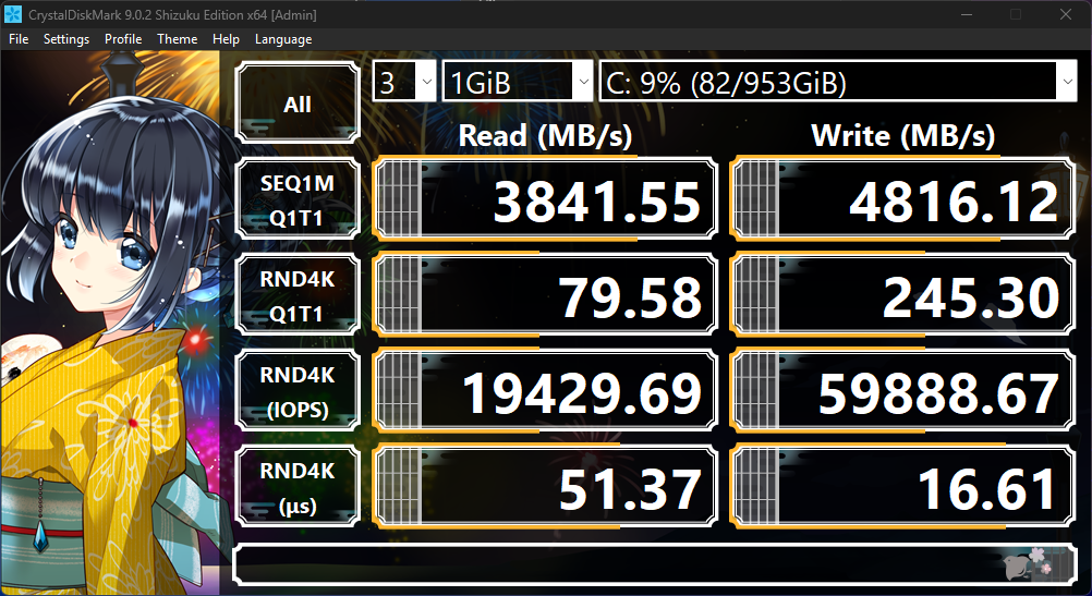 The 1TB PCIe Gen 4 x4 NVMe 2.0 SSD delivers the expected upgrade over the previous generation's Gen 3 drive, at least in sequential workloads. CrystalDiskMark 9 sequential performance (Q1T1) reached 3842 MB/s read and an impressive 4816 MB/s write, benefiting from the Gen 4 interface's higher bandwidth ceiling.