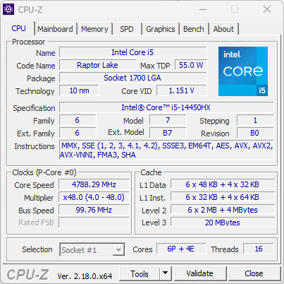 Processor: Intel Core i5-14450HX (10C/16T, 6P+4E, up to 4.8 GHz)