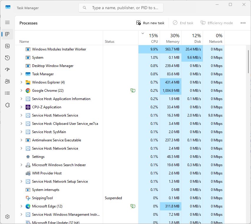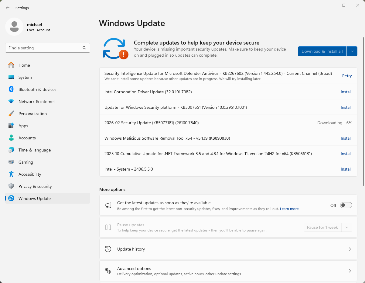 Upon first boot and connecting to the internet, Windows immediately began downloading and installing updates. This is expected behavior for any new PC, but the scale of the disruption was remarkable: the update process consumed nearly two hours, during which the processor was heavily occupied servicing Windows Update, Windows Defender definition downloads, driver installations, and background indexing, all competing for resources simultaneously. During this period, the system was sluggish to the point of being nearly unusable. Applications were slow to launch, the UI stuttered, and attempting any productive work felt like fighting the operating system for control of the hardware.