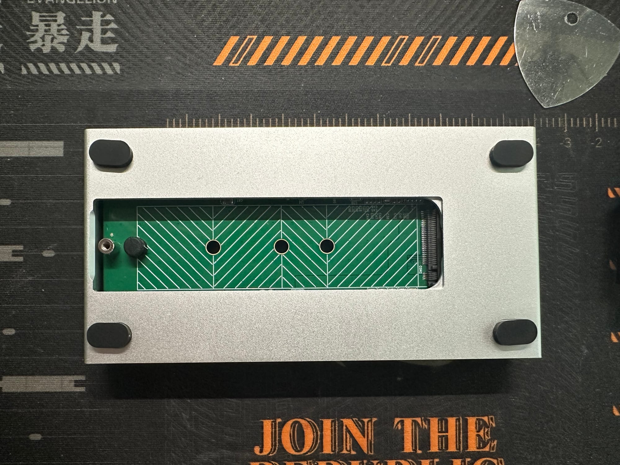 Inside we will find the M.2 slot, a few openings for different sizes of M.2 drives, and a rubber push-pin that secures the M.2 SSD to one of the openings. Four foam pads at each corner prevents scratches on your Mac when the enclosure is placed on top of the machine.