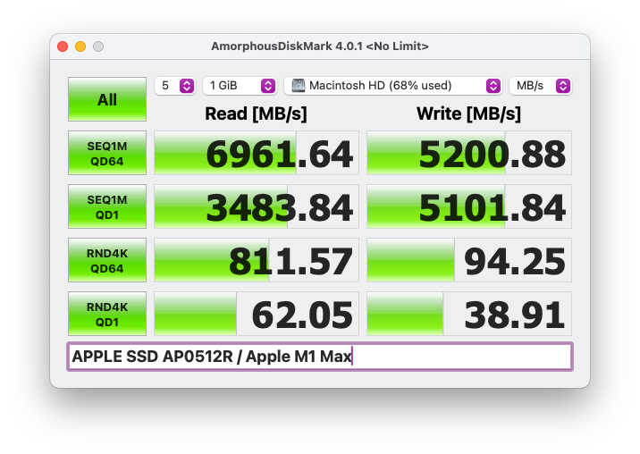 Reviewers love to tout the “blazing fast” internal storage of newer Macs, boasting numbers like 6300 MB/s read and 5200 MB/s write from tools like Blackmagic Disk Speed Test. My 4-year-old M1 Max Mac Studio (512GB SSD, ~70% full) reports 5085 MB/s read and 4400 MB/s write.