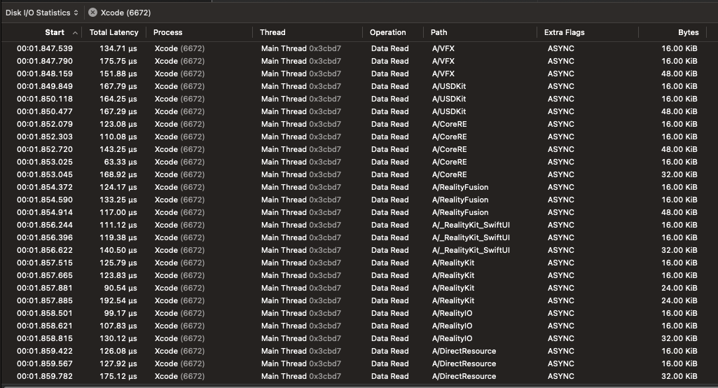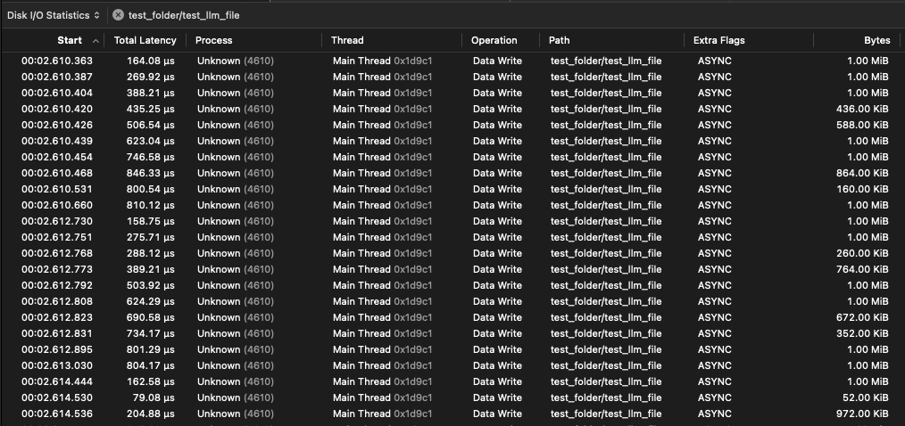 I copied the same LLM model from the external Samsung drive to the internal Apple SSD, as well as recorded the I/O operations with Instrument, and here’s the results.