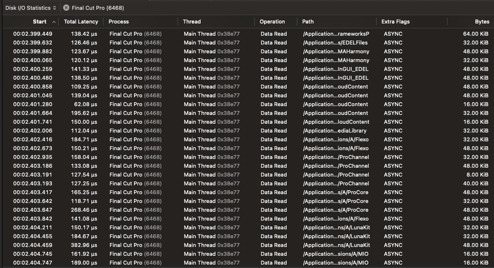 Now, let's look at how the drive performs under conditions more representative of typical macOS user scenarios. For this, we'll examine the filesystem I/O characteristics when opening two applications that I found are the slowest to launch: Final Cut Pro and Xcode.