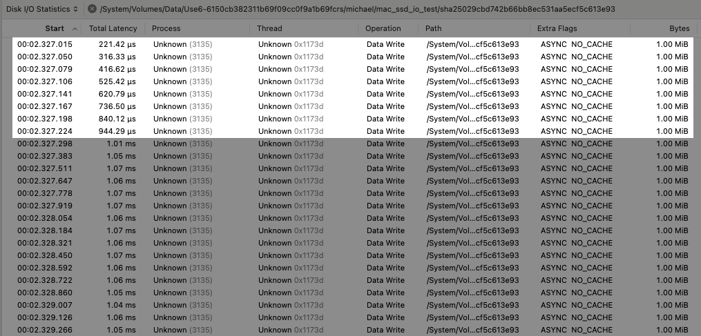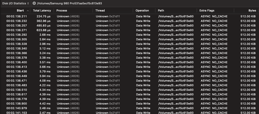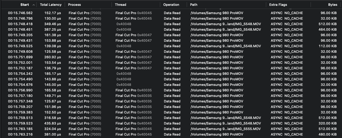 As we can see, the log file is absolutely littered by small file I/O operations that come nowhere close to the 512KB payload size when doing file copy in Finder, let alone the 1MB block size used by Blackmagic Disk Speed Test.