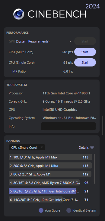 Cinebench 2024 testing yielded 548 points multi-threaded and 91 points single-threaded. While these scores confirm the chip remains viable for productivity workloads, the architecture's age shows when compared to newer Intel 12th/13th/14th generation or AMD Ryzen 6000/7000 series processors.