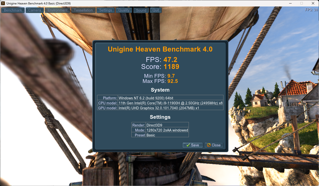 Integrated graphics performance lands squarely in entry-level territory. The Geekbench OpenCL compute score of 7334 and Heaven Benchmark result of 47.2 FPS (basic preset) confirm this system isn't targeting gaming workloads. PassMark's 3D graphics score of 1,582.7 points (23rd percentile) reinforces this limitation.