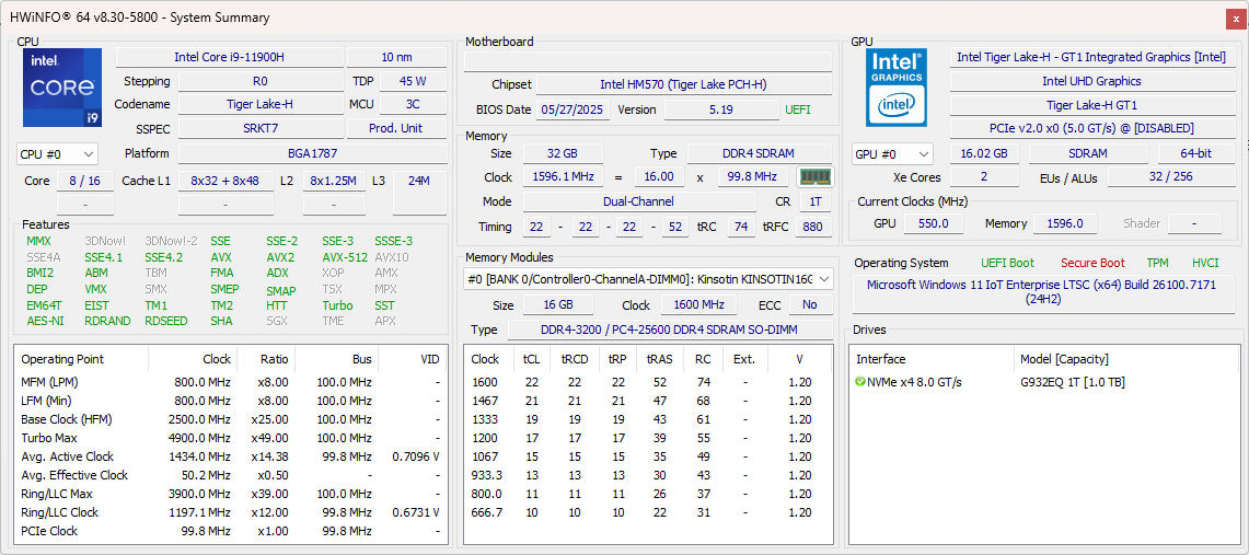Processor: Intel Core i9-11900H (8C/16T, up to 4.9 GHz)