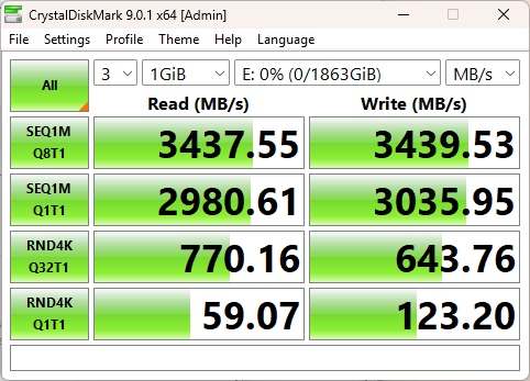 The 1TB PCIe Gen 3 SSD delivers mixed results typical of budget DRAMless QLC drives. CrystalDiskMark sequential performance was impressive, with reads and writes both exceeding 3,400 MB/s in the Q8T1 test. Single-queue sequential performance remained strong at approximately 3,000 MB/s in both directions.