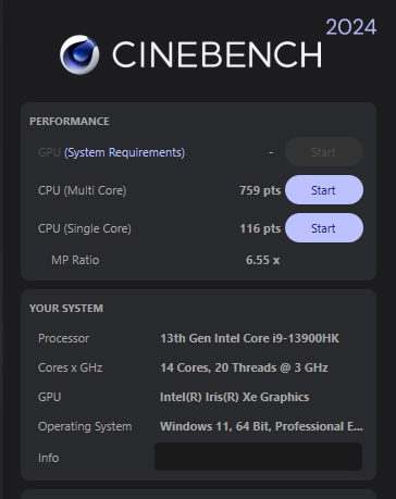 The Geekbench 6 single-core score of 2645 is the only number that matters for typical productivity work, and you can get similar single-threaded performance from processors costing a fraction of what the 13900HK commands. The multi-core score of 9030, while respectable, represents computing power that will sit idle for the vast majority of casual users. The Cinebench 2024 results (multi-thread 759, single-thread 116) tell the same story: you're paying for performance you'll never use.