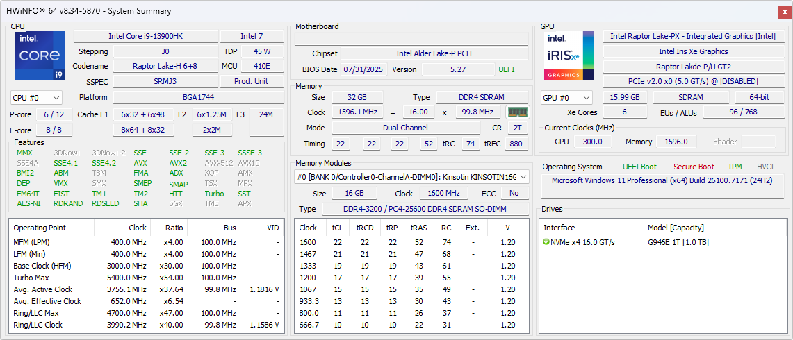 Let's start with what you're getting: an Intel Core i9-13900HK processor with 14 cores and 20 threads (specifically, 6 performance cores and 8 efficiency cores), 32GB of DDR4-3200 RAM, a 1TB PCIe Gen 4 SSD, integrated Iris Xe graphics, WiFi 6E via MediaTek MT7922, and 2.5 Gigabit Ethernet through a Realtek RTL8125 controller. On paper, this looks like a powerhouse. In practice, it's a machine caught between worlds, excelling at very specific tasks while being ill-suited for most mainstream use cases.