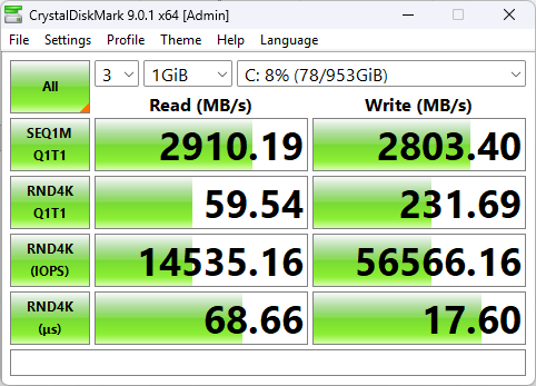 The storage performance—2910 MB/s sequential read and 2803 MB/s sequential write—is excellent for serving media files or running virtual machine storage. While the random performance (231.69 MB/s write, 59.54 MB/s read) isn't spectacular, it's adequate for typical server workloads where sequential performance often matters more.